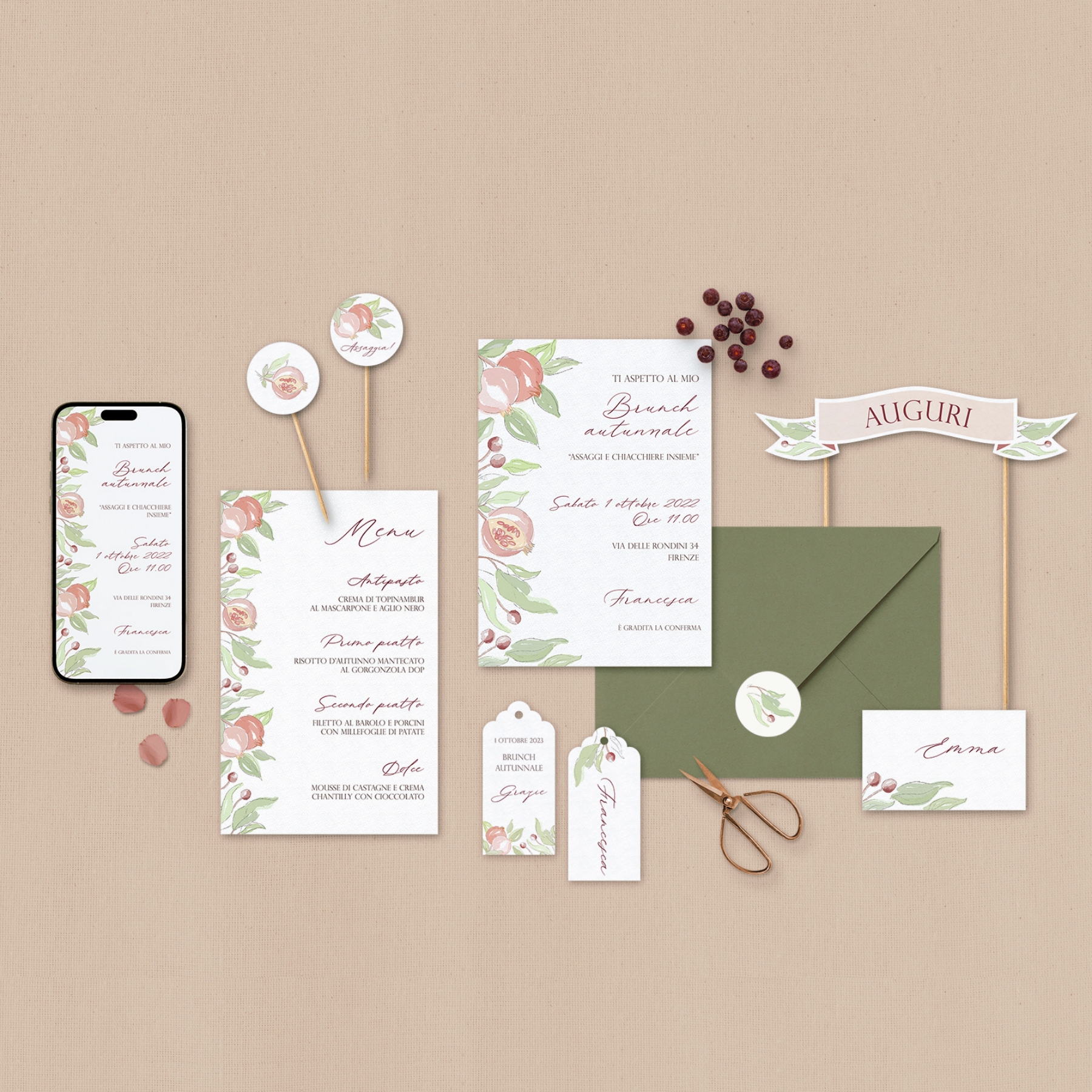 Ispirato alla natura autunnale, questo coordinato celebra la melagrana, simbolo di eleganza e abbondanza.