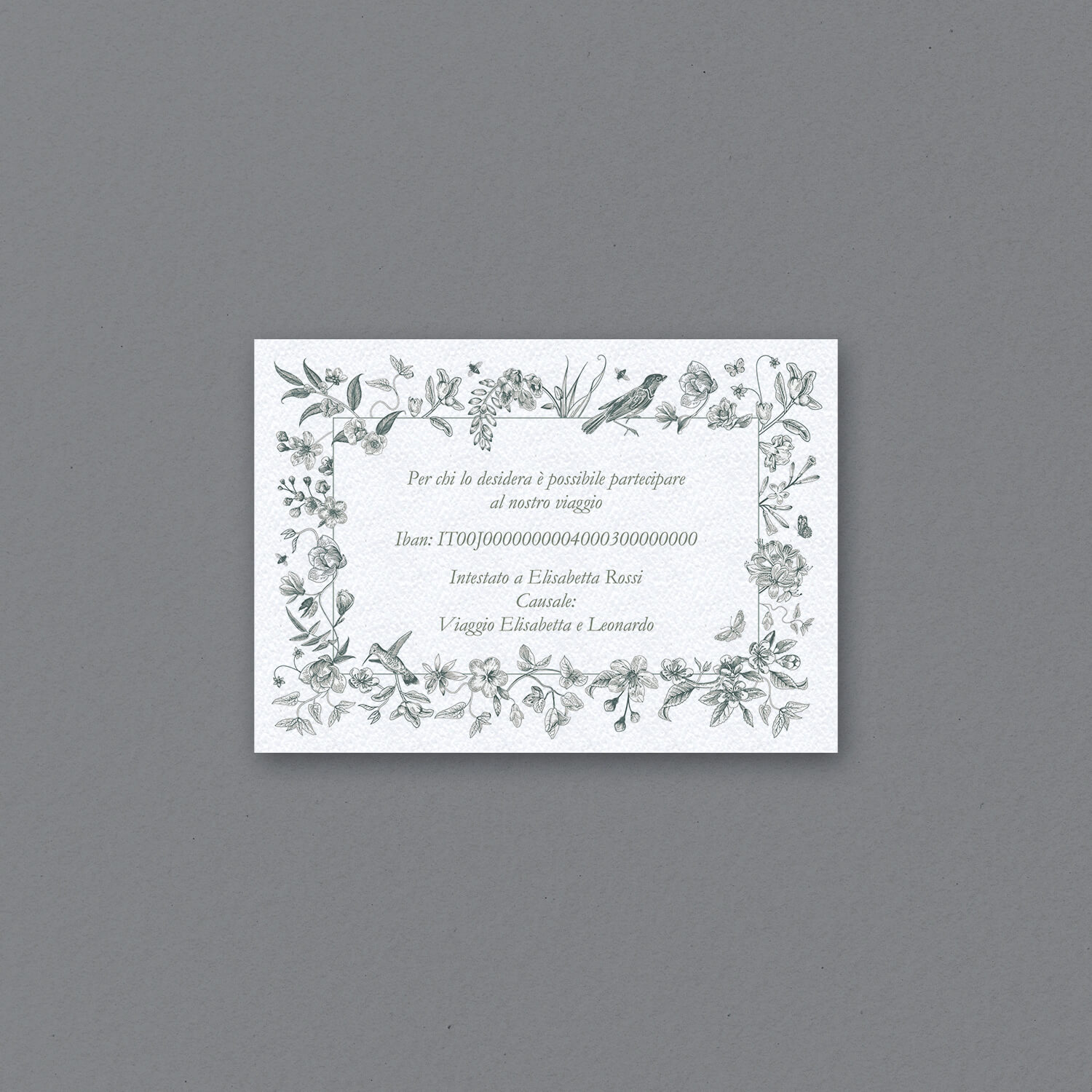 Il biglietto è stampato su cartoncino martellato di 250 g, con stampa digitale.